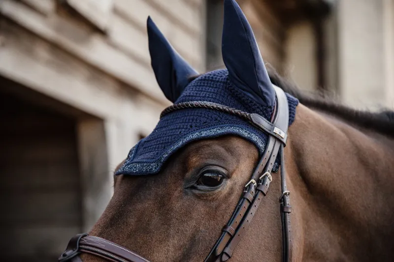 Our Fly Veil Glitter Stone is a combination of the modern American look and Kentucky Horsewear’s expertise. This fly veil is hand knitted for better durability, finished with a fancy piping and binding in classy glitter stone. The Fly Veil Glitter Stone protects the horse’s ears against flies while riding. The material around the ears is stretch and slim fit. The neck part is longer so it can’t slip. The Fly Veil Glitter Stone does not have a visible logo, therefore rider or sponsors can embroider their own logo. Hand washing only.