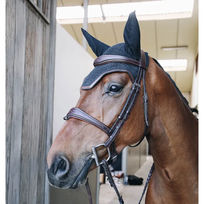 Our Fly Veil Leather is a combination of the modern American look and Kentucky Horsewear’s expertise. This fly veil is hand knitted for better durability, topped off with a brown artificial leather edge. The Fly Veil Leather protects the horse’s ears against flies while riding. The material around the ears is stretch and slim fit. The neck part is longer so it can’t slip. The Fly Veil Leather does not have a visible logo, therefore rider or sponsors can embroider their own logo. Hand washing only.