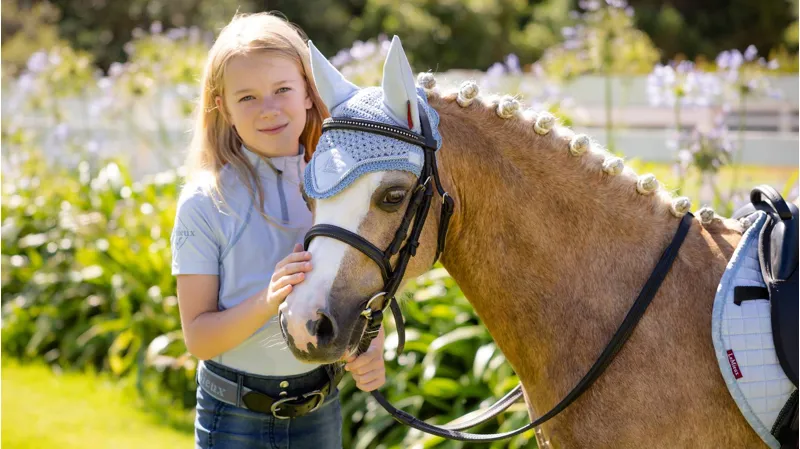 At last a premium designer collection for Kids! Mini LeMieux is intended to appeal to the under twelves with an eye for style. Designed particularly for 11.2hh to 13hh ponies, the Mini LeMieux Fly Hood is hand made from two styles of close-knit crochet with comfortable high-density fabric ears that soften sound. Suede embroidered detailing and colour matched braid complete the range.