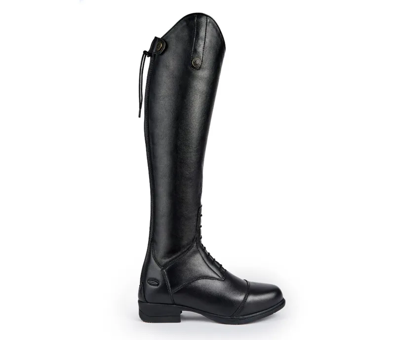Effortless style is offered by these long riding boots, elegantly crafted using synthetic leather for an easy-care finish. Luisa boots achieve a close leg fit by pairing hard wearing inner calves with softer stretch outer panels that hug the leg. Supportive insoles and shock absorbing soles ensure feet stay energised in the stirrup. Key features: Quick clean faux leather. WickAway stay dry linings. Soft piqued leather inner trims. Stretch mock lace detail. Dressage cut tops. YKK zips. Upper leather zip security tabs. Non-slip spur rests. ActiveFlex insoles with Impact Support System. Moretta shock absorbing rubber soles. Steel shanks.