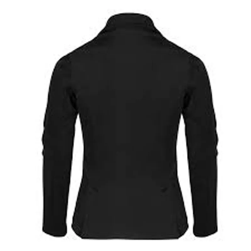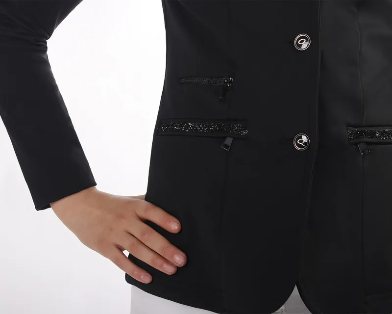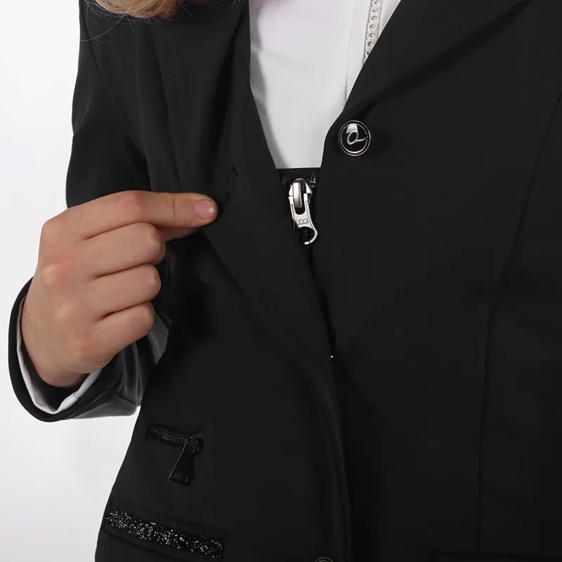 Shine during your competition with this chic competition jacket. The jacket has a concealed zip behind the button closure so that the buttons won’t pull. The stretchy, breathable fabric ensures a comfortable ride and is also water-repellent. The glitter tape on the zip pockets and black faux zip pocket complete the jacket.