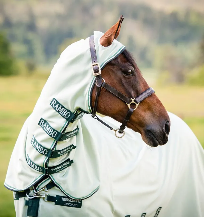 The Rambo® Hoody (0g Light) Rug is our premium hoody rug designed to act as a trustworthy barrier against summer skin irritations, flies and UV rays. Made of a soft and very durable 1000D Polyester with close woven fabric so biting insects can’t get through. Top to tail maximum protection with extended belly coverage with Velcro closure and three cross surcingle’s that wrap around the body, a supersized tail flap and an integrated neck cover (non-removable) with shaped ear holes. This rug gives exceptional coverage during those warmer months, giving you peace of mind that your horse is comfortable and protected.