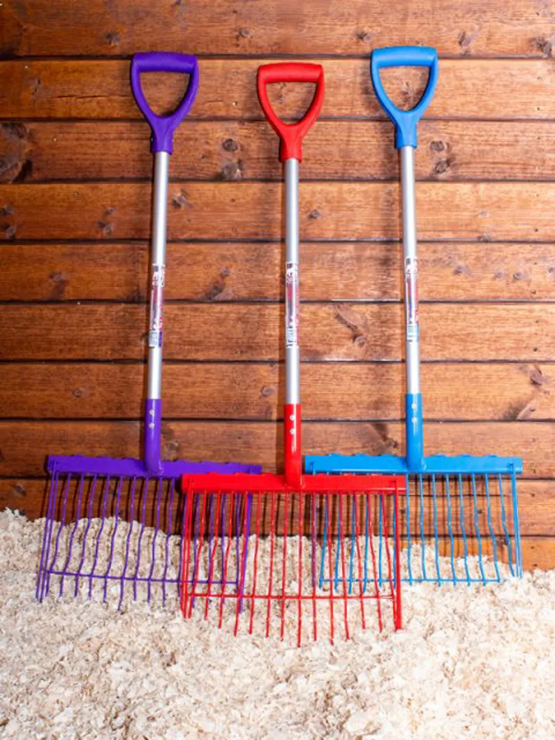 Red Gorilla D Handle Riddler Shavings Fork Red features an all-new design and all-new colours. Its unique registered design combines a traditional bedding fork with unique wavy tines to reduce bedding waste. The new Riddler has increased durability and features a new lightweight aluminium handle. Now half a kilo lighter, the Riddler is a super-strong shavings fork with hardened tempered metal tines which make this a product built to last.