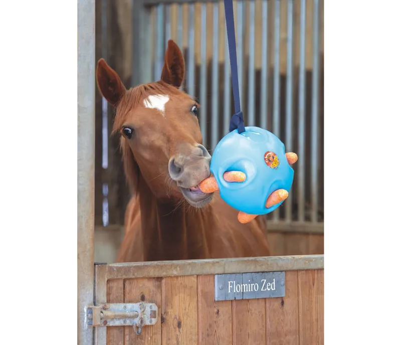 Boredom and stress busting, your horse or pony will love playing with the Carrot Ball which helps increase dexterity and encourages learning with healthy treats as a reward. Carrot Ball is a unique intelligent toy, designed to keep your horse or pony entertained for hours, watch them play with it around the paddock or hang one up in the stable or horsebox. The anti-burst construction is inflated using a bicycle pump and a special adaptor (included with the ball). The innovative HUG & TUG™ feature allows varied pressure inside the ball to vary the effort required to remove the carrots once the horse is familiar with the toy. Suitable for dispensing carrots, turnips, parsnips, apple or anything that will be held firm in the holes.